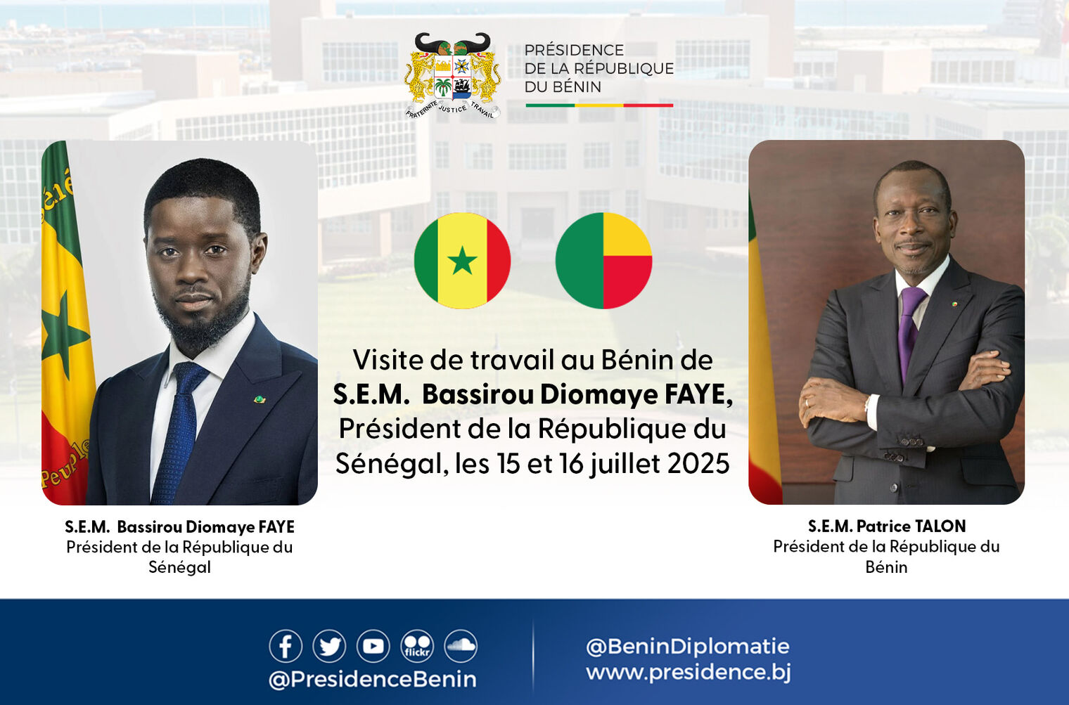 Sur invitation du Président de la République, Monsieur Patrice TALON, le Président de la République du Sénégal, Son Excellence Monsieur Bassirou Diomaye Diakhar FAYE, effectuera les 15 et 16 juillet 2025, une visite de travail au Bénin. L'illustre hôte sera accueilli dans l'après-midi de ce mardi 15 juillet 2025 à l’Aéroport International Cardinal Bernardin GANTIN de Cotonou avec les honneurs dus à son rang par le Ministre des Affaires Étrangères, Monsieur Olushegun ADJADI BAKARI.