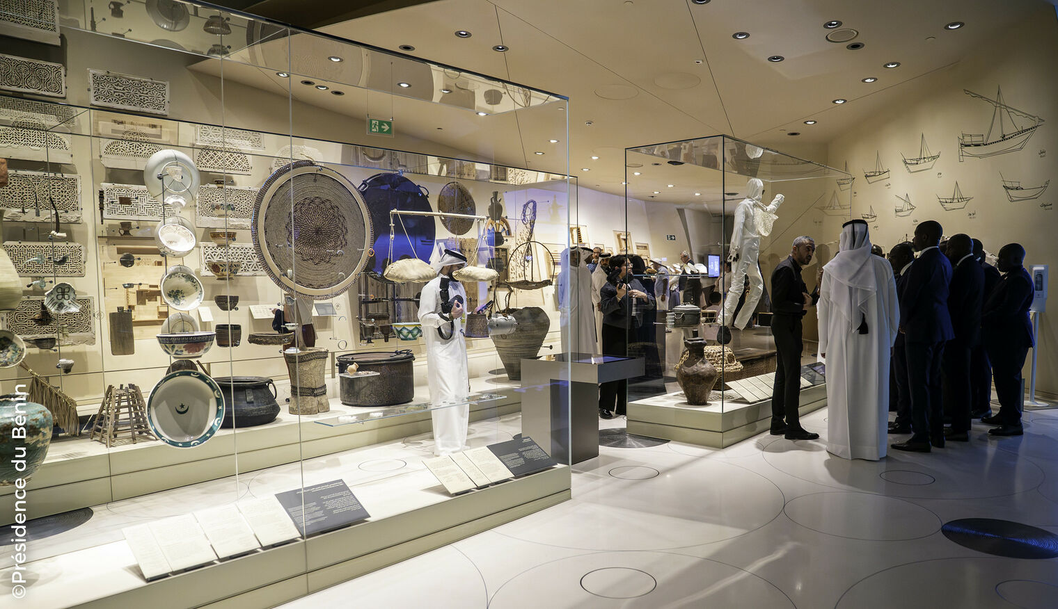 Accueilli par Son Excellence Sheikha Al-Mayassa, présidente du Musée, le Chef de l'État a pu découvrir l’architecture remarquable du bâtiment, ainsi que les expositions retraçant l’histoire, la culture et le développement économique du Qatar.
