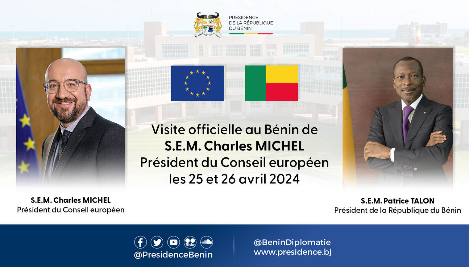 Sur invitation du Président de la République, Monsieur Patrice TALON, Son Excellence Monsieur Charles MICHEL, Président du Conseil Européen, effectuera les 25 et 26 avril 2024, une visite officielle en République du Bénin. Monsieur Charles MICHEL sera accueilli dans la soirée de ce jeudi 25 avril 2024 à l’aéroport international de Cotonou par une délégation gouvernementale.
