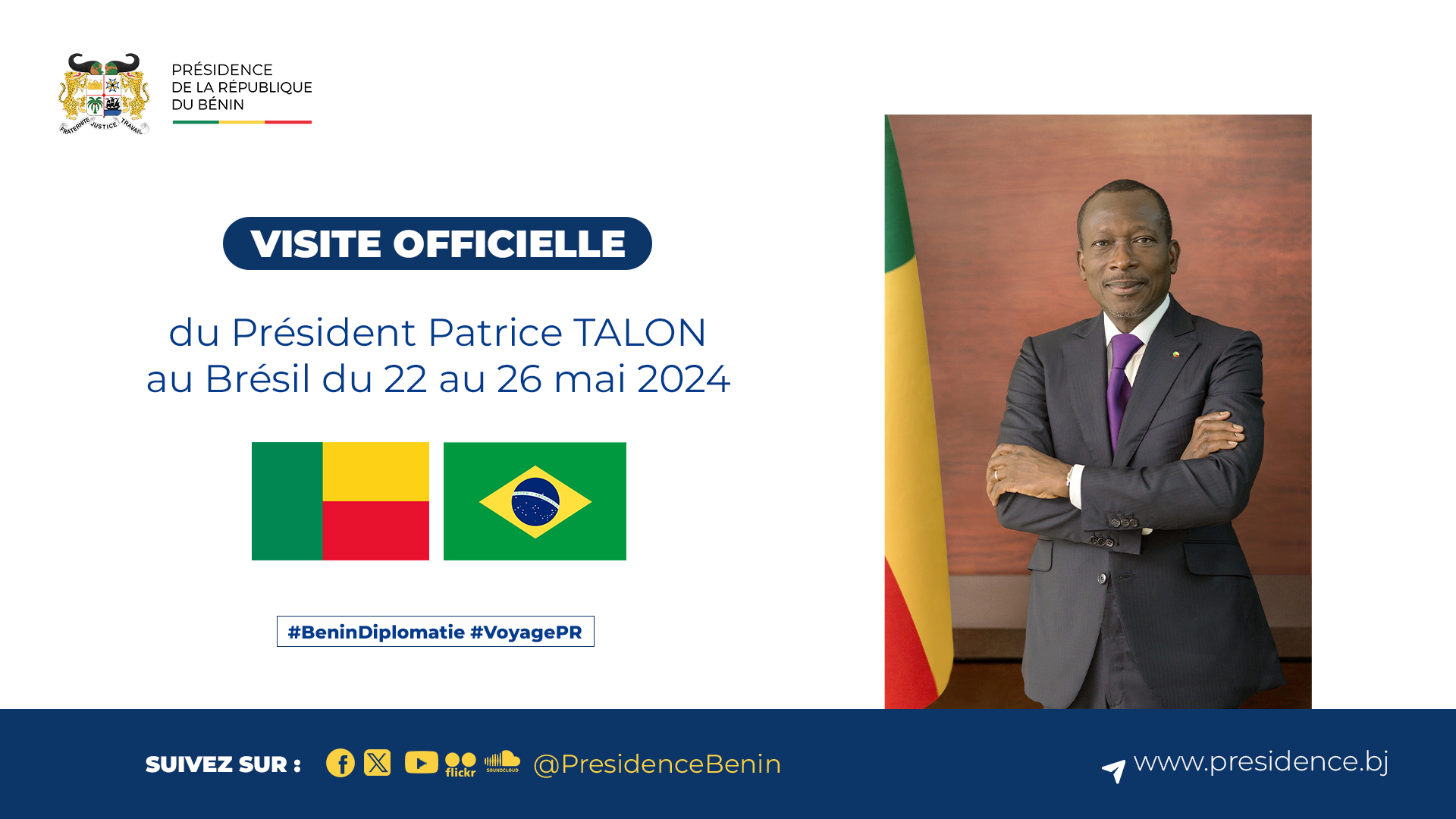 Du 22 au 26 mai 2024, le Chef de l'État, Monsieur Patrice TALON, accompagné d'une délégation, effectue une visite officielle au Brésil. Son séjour se déroulera en 3 étapes principales :