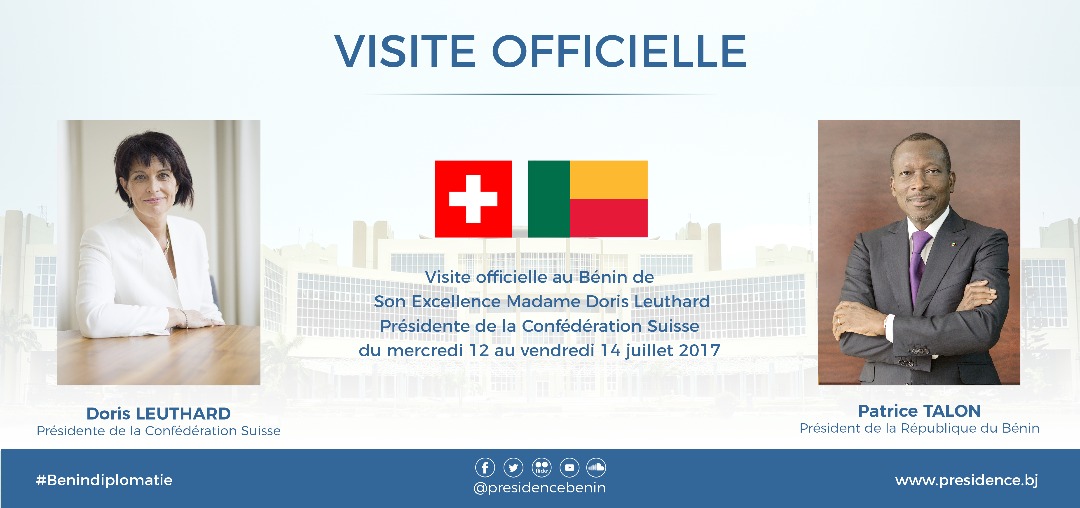La Présidente de la Confédération Suisse, Son Excellence Madame Doris Leuthard, effectuera une visite officielle dans notre pays le Bénin à partir de ce jour mercredi 12 juillet 2017 à l’invitation de Son Excellence Monsieur Patrice Talon, Président de la République, Chef de l’Etat, Chef du gouvernement.