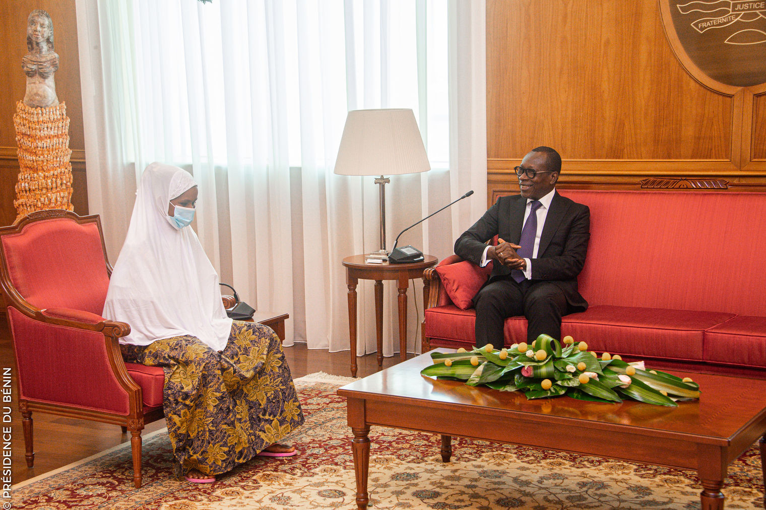 Ce mercredi 19 août 2020, le Président de la République, Monsieur Patrice TALON, a reçu en audience au Palais de la Marina Madame Sakinatou HAROUNA. Cette jeune dame qui a fait parler d’elle en sauvant la vie à cinq (05) des onze (11) passagers d'une barque, lors du naufrage survenu le 3 août dernier sur le fleuve Okpara à Woria, un village administratif de l’arrondissement de Tchatchou, commune de Tchaourou.