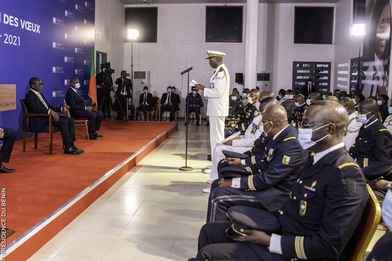La tradition a encore été respectée cette année. Les membres des différentes Institutions de la République, la Haute hiérarchie militaire et le Corps diplomatique accrédité au Bénin ont présenté, dans la matinée de ce jeudi 21 janvier 2021, les vœux au Chef de l'Etat, Monsieur Patrice TALON. Cette cérémonie fort simple mais solennelle décomposée en 3 séquences, a été visiblement marquée par la crise sanitaire. En effet, le respect des gestes barrières était strict : distanciation physique, port de masque, absence d'accolades et de photos de famille. Une situation que le Président de la République a déplorée et formé le vœu que 2021 puisse connaître la fin de cette pandémie.