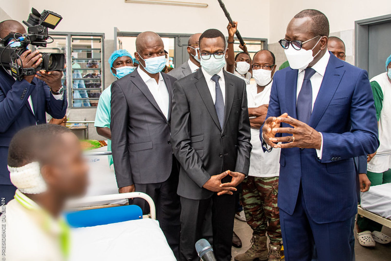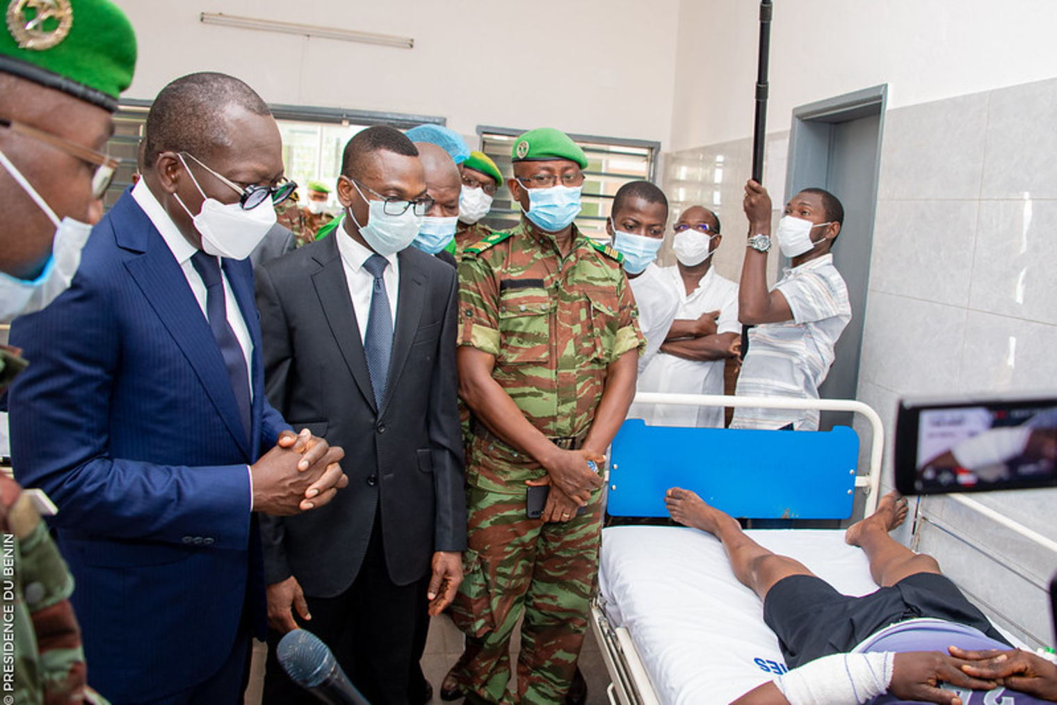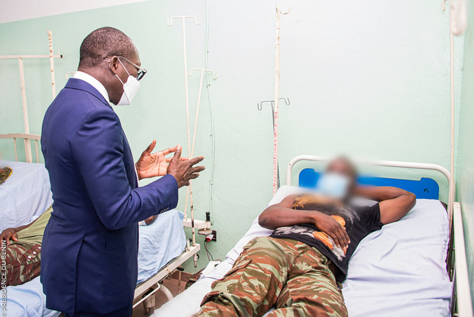 Le Président Patrice TALON a rendu visite ce mercredi 14 avril 2021 aux forces de sécurité et de défense blessées pendant les manifestations préélectorales et hospitalisées à l’Hôpital d'instruction des armées de Cotonou.
