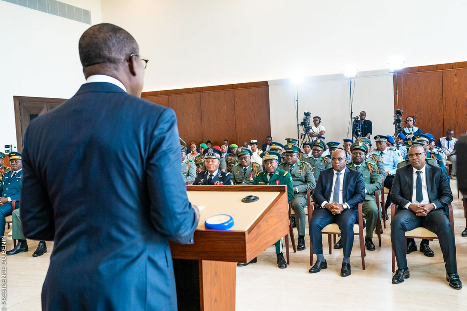 Le Chef de l'État a, par ailleurs, témoigné sa satisfaction et sa fierté face à la bravoure des forces de sécurité et de défense du Bénin qui se sont montrées très efficaces, très professionnelles dans une année 2022 éprouvante en termes de menaces sécuritaires notamment menaces djihadistes. Le Président de la république a également rendu hommage aux vaillants soldats tombés sur le champ d'honneur, et a promis que la loi dédiée à leurs ayant droit sera appliquée sans faute. Il rassure que les efforts vont se poursuivre pour plus de montée en puissance des forces pour la sécurité des personnes et des biens et du territoire en général afin que le défi sécuritaire continue d'être relevé.