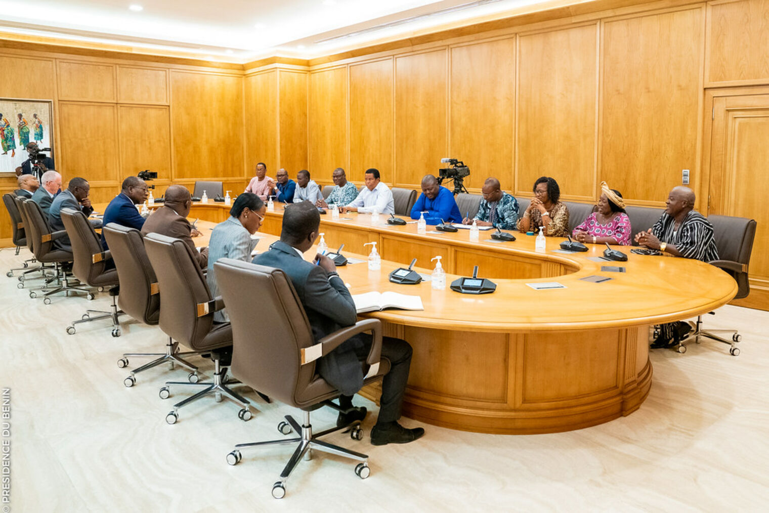 Le Chef de l’État, Monsieur Patrice TALON, en présence du Ministre d’État chargé du Développement et de la Coordination de l'Action gouvernementale, Abdoulaye BIO TCHANÉ, du Ministre de l’Agriculture, de l’Élevage et de la Pêche, Gaston Cossi DOSSOUHOUI, et du Ministre de l’Industrie et du Commerce, Shadiya Alimatou ASSOUMAN, a tenu une séance de travail avec les responsables de l’Union Nationale des Producteurs de Soja au Bénin (UNAPS-Bénin), de l’Association Interprofessionnelle du Coton (AIC) et de la Fédération Nationale de Producteurs de Coton du Bénin (FNPC), ce mardi 11 Avril 2023 au Palais de la Marina. Au centre des discussions, trouver une solution à la crise qui secoue actuellement la filière soja. Et la séance a accouché de bonnes nouvelles pour les sojaculteurs.