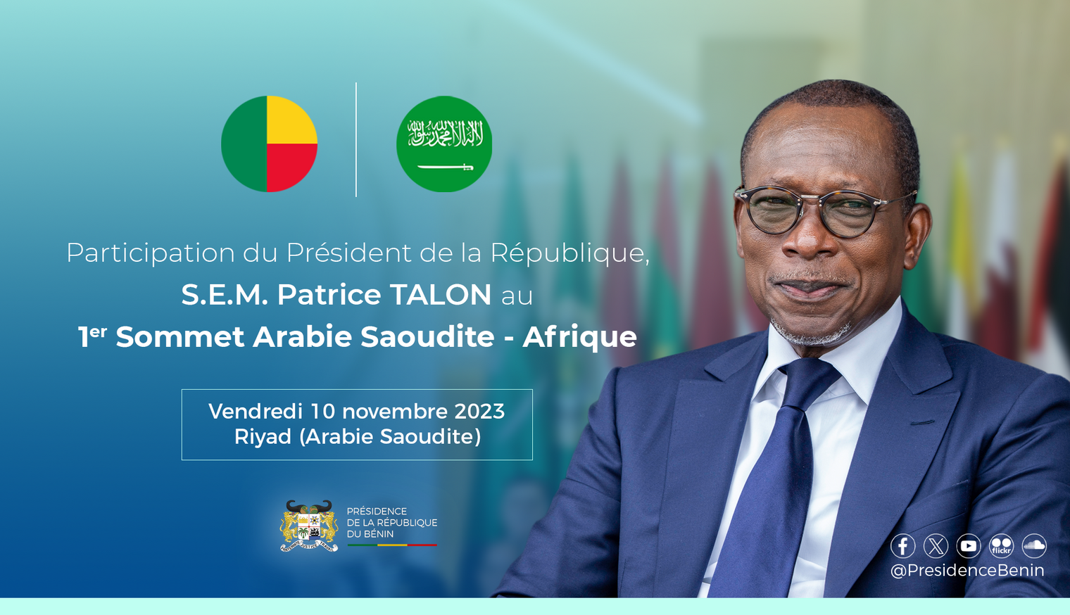 Sur invitation de Sa Majesté Salman Bin Abdulaziz Al SAOUD, Gardien des deux Saintes Mosquées et Roi d’Arabie Saoudite et du Prince Héritier et Premier Ministre Mohamed Bin SALMAN, le Président de la République, Son Excellence Monsieur Patrice TALON, prendra part, aux côtés de ses pairs africains, le vendredi 10 novembre 2023 à Riyad (Arabie Saoudite), au Premier Sommet Arabie Saoudite - Afrique.