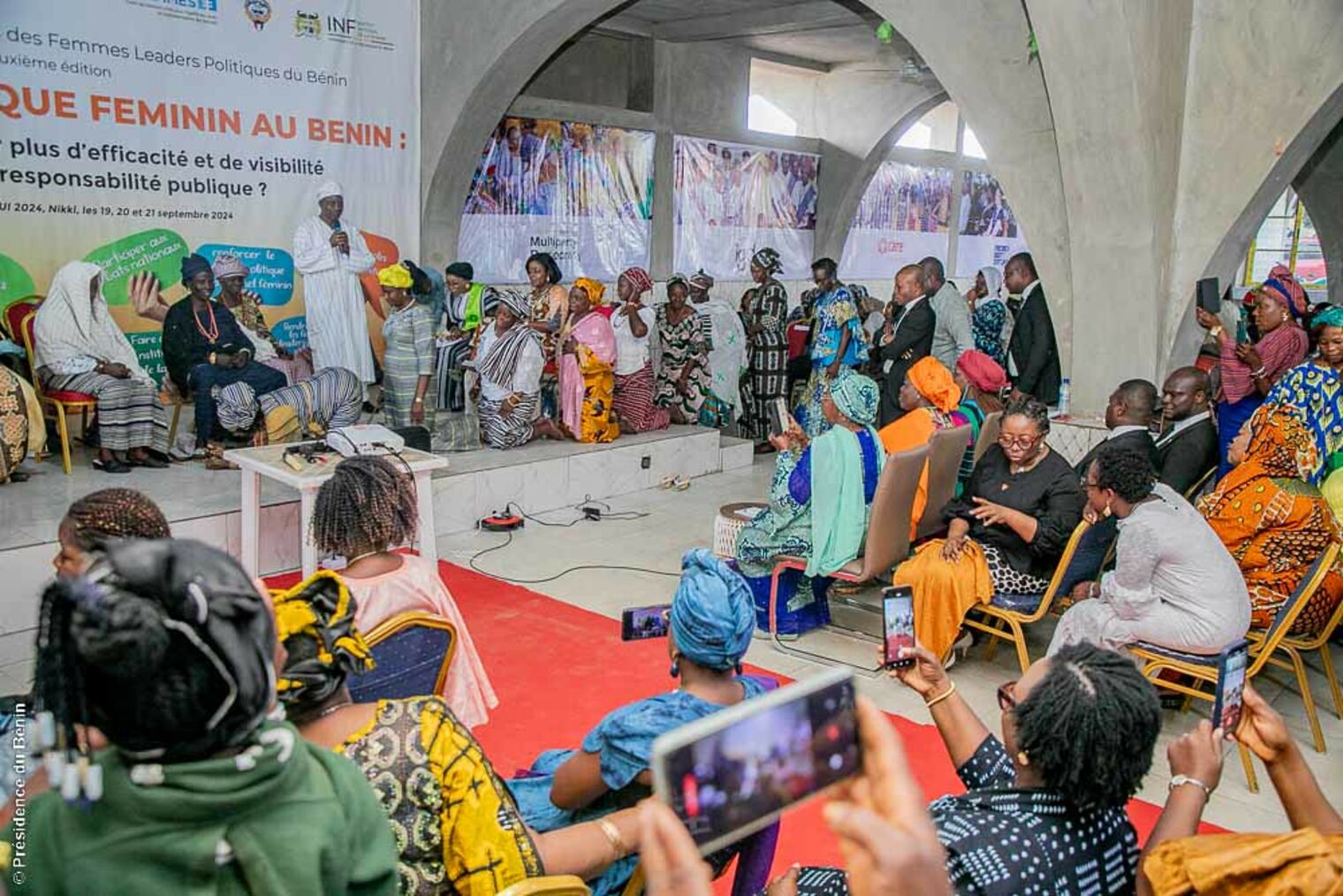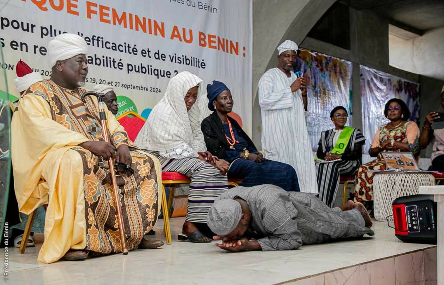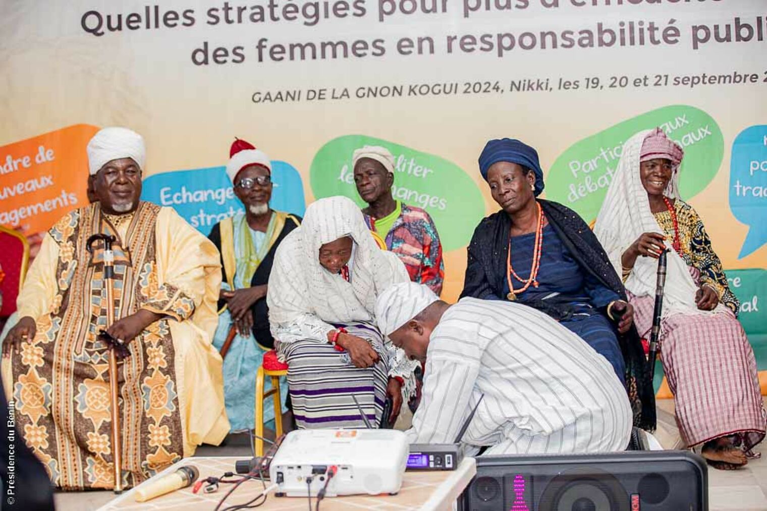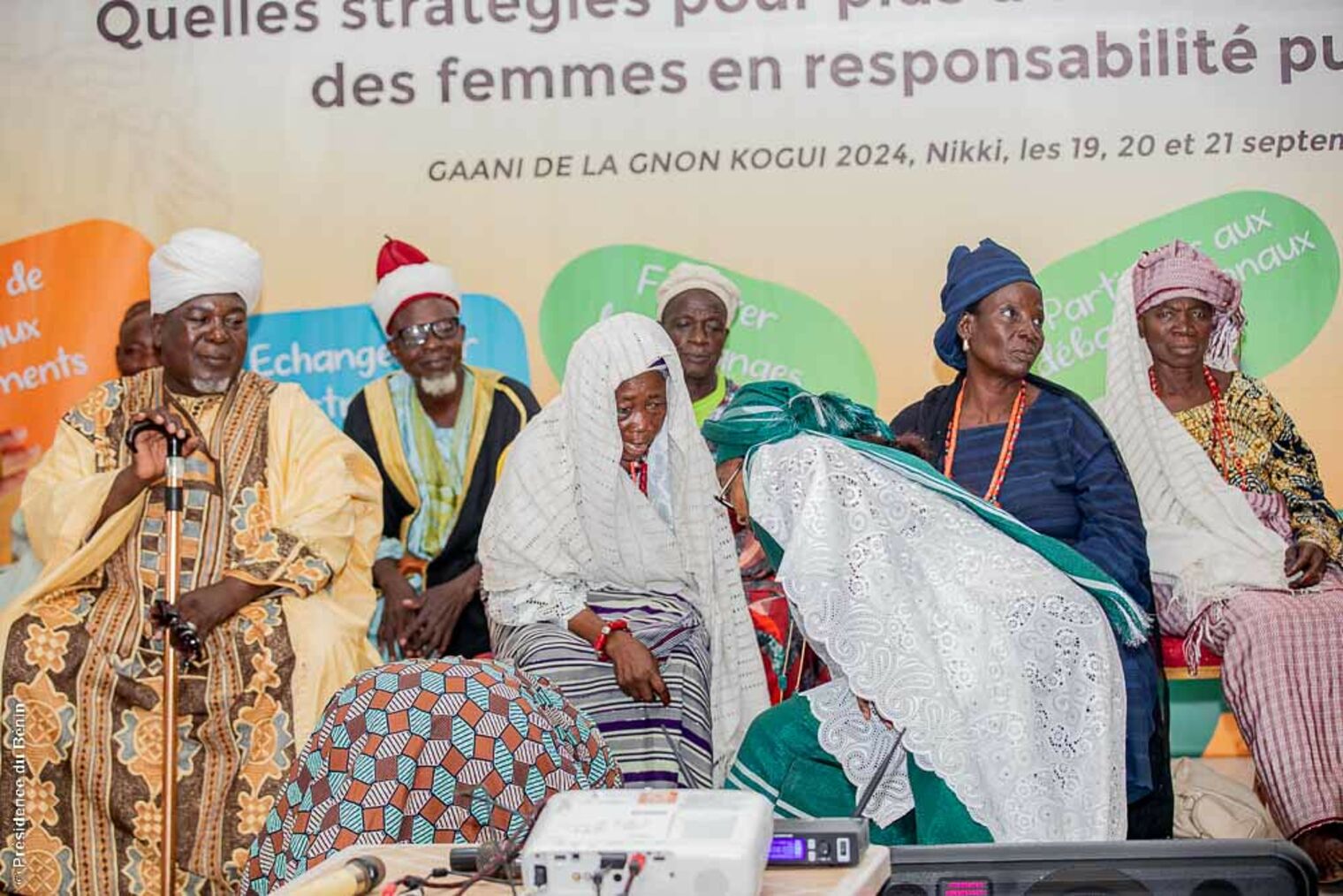 Des explications sur la "GNON KOGUI" ont pris en compte les dimensions de son rôle. Sa Majesté Issiakou Sina DOUNWIROU, Premier Ministre de la Cour impériale de Nikki a entretenu les participantes sur les différents contours du pouvoir de la Vice-Reine. Il a insisté sur le fait que, bien qu’elle soit la principale Conseillère de l’Empereur, son pouvoir ne se limite pas à une simple fonction consultative. En effet, elle joue un rôle actif dans la gouvernance, notamment dans la prise de décisions importantes concernant la politique intérieure et extérieure de l'Empire. Elle est également chargée de la supervision de certaines régions de l’Empire, un pouvoir délégué par l'Empereur lui-même, qui témoigne de la confiance absolue qu'il lui accorde.