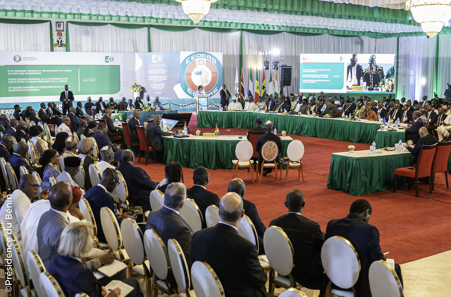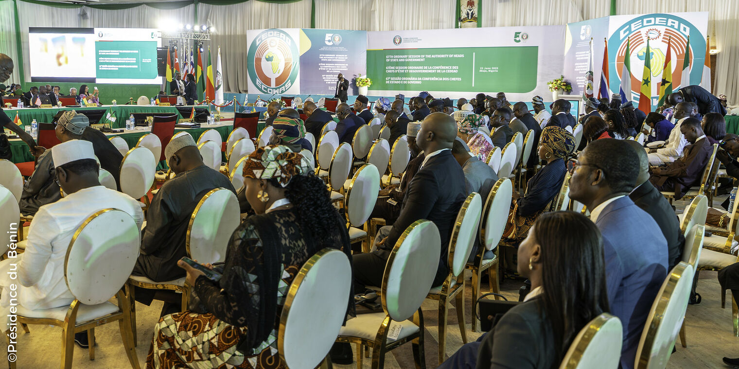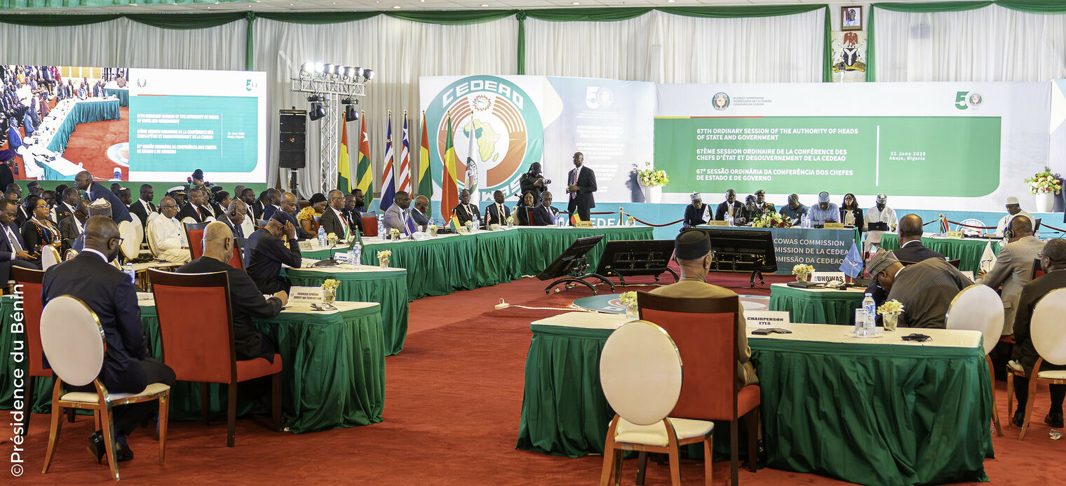 Le dimanche 22 juin 2025, le Président de la République, Monsieur Patrice TALON, a participé à la 67ème Session ordinaire de la Conférence des Chefs d'État et de Gouvernement de la Communauté Économique des États de l’Afrique de l’Ouest (CEDEAO), tenue à Abuja, au Nigéria. Cette rencontre de haut niveau, organisée dans un contexte marqué par de profondes mutations régionales, a rassemblé plusieurs dirigeants de la sous-région pour échanger sur les défis majeurs auxquels fait face la CEDEAO.