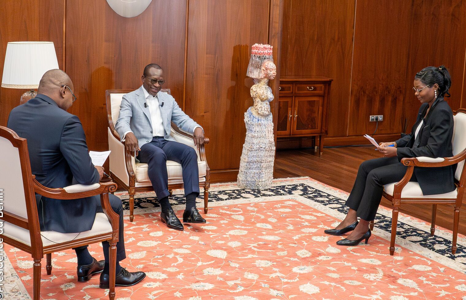 Journaliste 1 : Bonjour à toutes et à tous et bienvenue dans cet entretien exclusif avec le chef de l'État. Le président Patrice Talon, qui nous reçoit au Palais de la Marina, un palais qui a fait sa mue, rénovée à la hauteur de la tâche qui s'y mène depuis 2016. Monsieur le Président, bonjour et merci de nous recevoir.